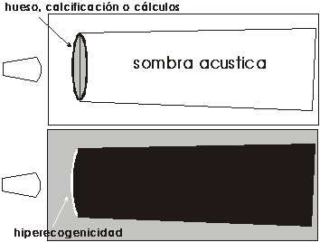 1.- Cuando el medio es hueso o tejido calcificado : existe hiperecogenicidad en la interfase anterior y ausencia de señales (sombra) por detrás. Esto se debe al alto grado de reflexión de la interfase de este tipo y el alto coeficiente de absoción.