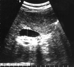 Ecografía pelviana. Corte trasversal (axial) en la que se observa la típica imagen rectangular de vejiga, en el piso de la misma, a nivel de línea media imagen ecogénica de forma ovoide correspondiente a región inferior de útero. Situados posterolateralmente se observa dos imágenes casi simétricas hioecoicas, con refuerzos posterior, de forma ovoidea, homogénea en su mayor parte correspondiente a ambos ovarios de tamaño dentro de parámetros normales.