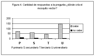 El alto porcentaje del personal que accedió a la encuesta reveló un gran interés sobre el problema del dengue. Sin embargo un porcentaje importante de los profesionales se negó a participar de la misma. Estos resultados coincidirían con el trabajo de Almirón y Ludueña Almeida (1998) realizado en Córboda (3), donde la población encuestada con mayor nivel de instrucción se negó a participar de la entrevista, en el mismo se concluye que existe una relación directa entre el nivel de conocimiento con el nivel socio-económico respectivo, es decir, a menor nivel socio-económico menos conocimiento del mosquito y su relación con la salud. Las respuestas por parte del personal del grupo 4 con instrucción universitaria, fueron más precisas y detalladas que las de los demás grupos. A pesar de ello, el alto porcentaje de respuestas positivas, con relación al conocimiento de la enfermedad, forma de transmisión, tratamiento, medidas preventivas y las características biológicas del mosquito vector indicarían que el personal encuestado del Hospital Pediátrico tiene un conocimiento básico de este tema. A pesar que un alto porcentaje del Hospital manifestó haber concurrido a jornadas de capacitación sobre el tema hubo respuestas que demostraron, que les faltó conocimiento de aspectos importantes de la enfermedad como saber qué es el dengue hemorrágico o el tratamiento de la misma. Sería necesario realizar un relevamiento posterior a los cursos que permitan analizar el grado de conocimientos y preparación que dichas jornadas transmiten.