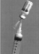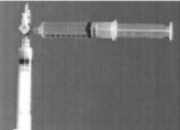 Fig. 3: Primer plano de un agente de contraste que está siendo retirado en una jeringa. Note el largo de la aguja utilizado para hacer el agujero adicional para ventilar el interior del frasco.