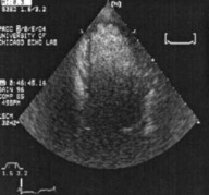 Fig. 5: Un ejemplo de una gran cantidad de agente de contraste en el ventrículo izquierdo como se ve en esta vista apical de la cuarta cámara. Hay una marcada atenuación de la línea basal media del ventrículo izquierdo causado por este artefacto del contraste.