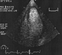 Fig. 6: Vista apical de la cuarta cámara mostrando una técnica de imagen apropiada durante un examen con contraste ecocardiográfico. La cavidad ventricular izquierda es uniformemente opacificada sin atenuación basal.