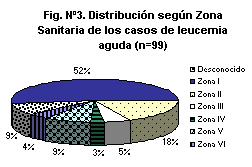 Se encontró en el Sector Público de la provincia del Chaco, 99 casos de leucemias agudas (40 leucemias linfoblásticas agudas y 59 leucemias mieloblásticas agudas) entre Enero de 1995 y Enero del 2005, distribuidos la gran mayoría (69 casos) entre las Zonas Sanitarias I y II.