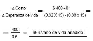 Realizando un análisis de costo-efectividad de dicho tratamiento, podemos compararlo con placebo, suponiendo que la administración de una ampolla de estreptoquinasa vale $ 400 y que los demás costos asistenciales son semejantes entre los pacientes que la reciben, como los que no la reciben.(8)