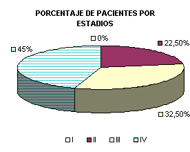El estadío en el cual se encontraba el mayor porcentaje de los pacientes al momento del diagnóstico fue el Estadío III (45%), 32,5% en el Estadío IV, y 22,5% en estadío II; mientras que no se encontraron casos en Estadío I (0%), (Gráfico Nº 2).